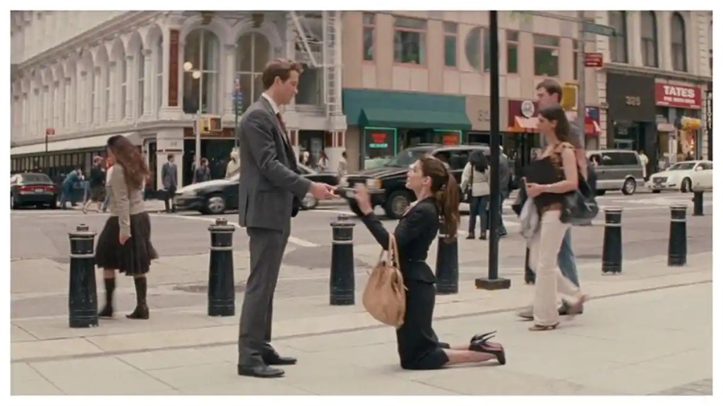 Andrew forcing Margaret to fake propose to him in the street to get her back. Image obtained from https://wow.tribunnews.com/2020/09/19/sinopsis-film-romantis-netflix-the-proposal-jatuh-cinta-yang-bermula-dari-pernikahan-settingan#